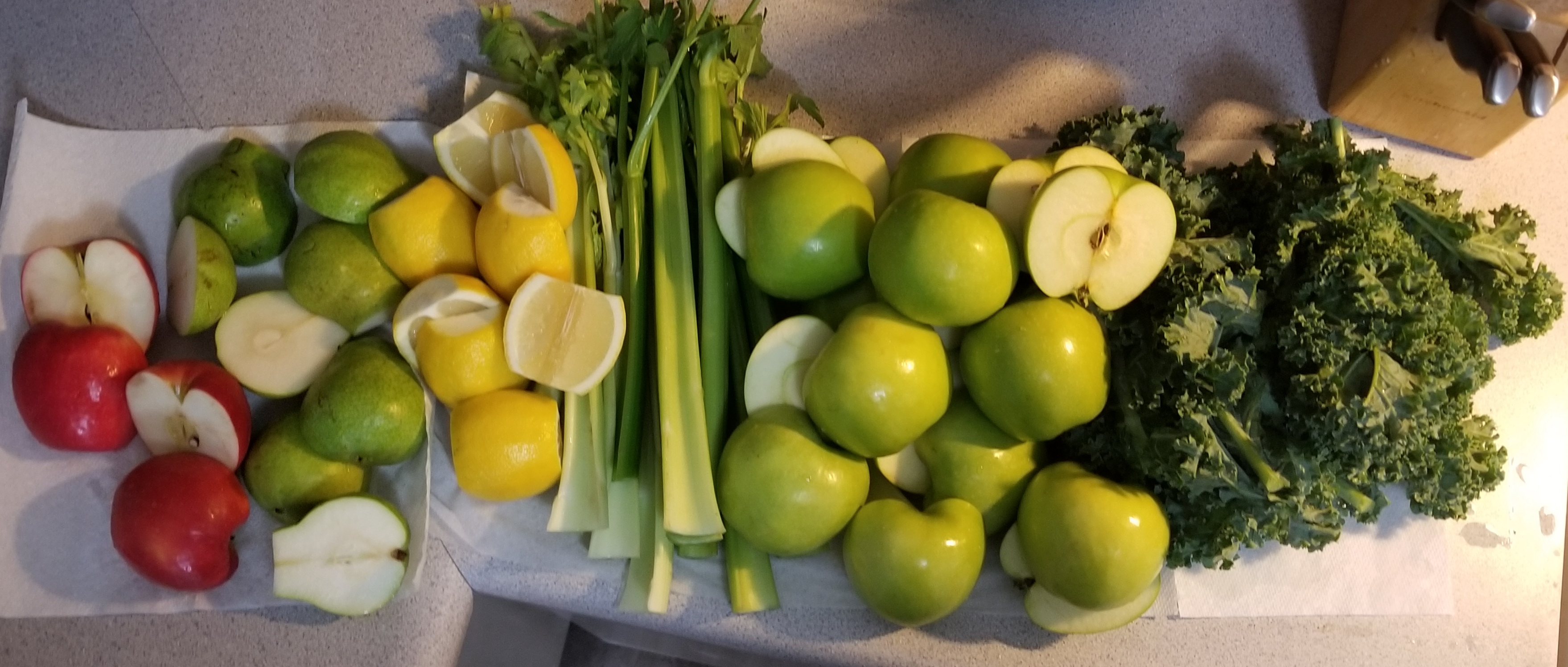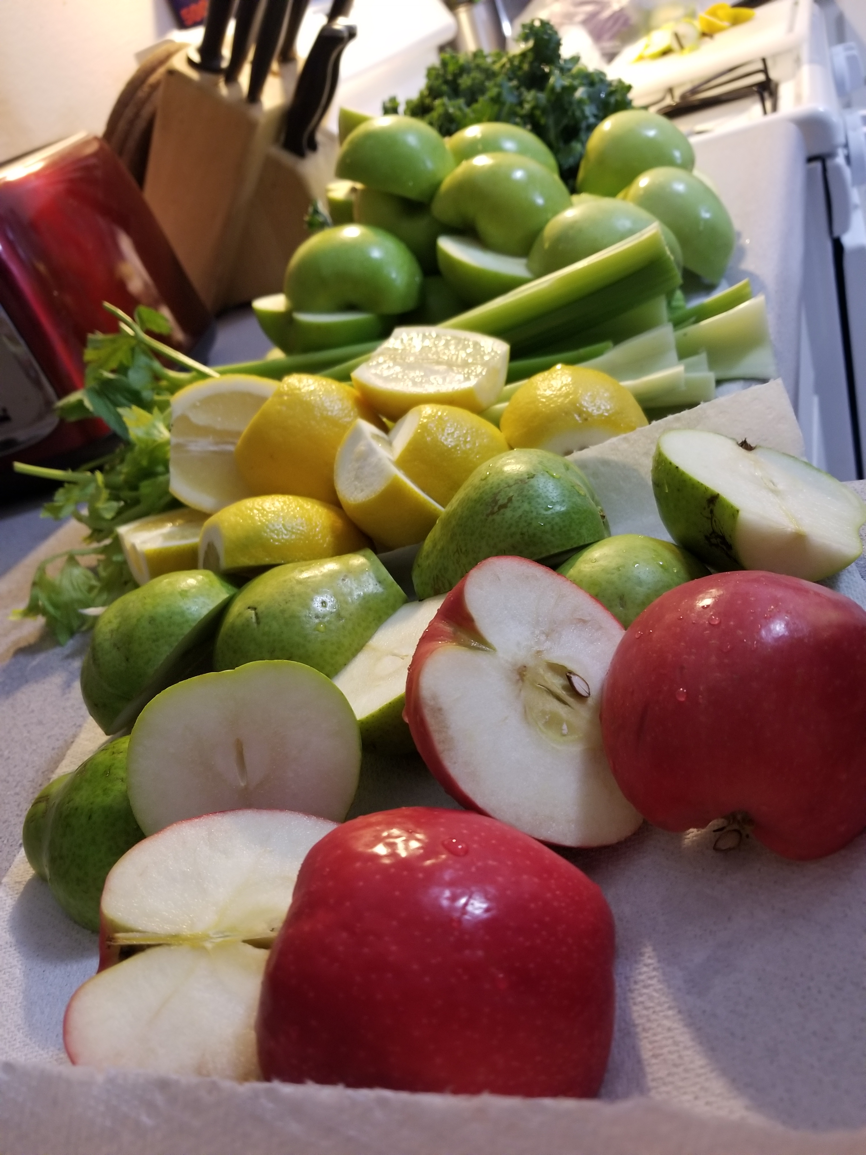 To prepare, I made my first batch of juice tonight. I wanted to get an estimate on the time it would take to prepare, how much juice a batch would make, etc. It has been about seven years since I last made juice. I was surprised that it didn’t take as long as I remembered. I would say about 30 minutes, start to finish, including the clean up and washing the juicer. That’s less time than cooking a meal, if you count clean up and prep. I made a little over a half gallon of juice, which is about half to 3/4 of the juice that I need for a day. I used kale, celery, green apples, pink lady apples, lemons and pears. When it was done, I poured my kids and my husband a sample, pouring my son half of what I poured the rest of us. My daughter said it was good, but could benefit from pineapple, my husband said it tasted like a lemonhead candy and we should all it lemon drop, and my son said it was too sour (but this kid uses a whole lemon on one piece of fish, so I am pretty sure he meant too green). My neighbors even came over and had a sample. One liked it and asked for seconds, the other wasn’t convinced that celery and kale belong in juice. Either way, I now have an idea of how long it will take and how much produce I need to buy. Planning ✔.