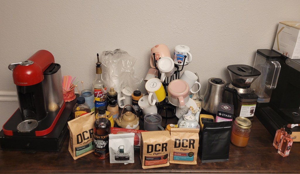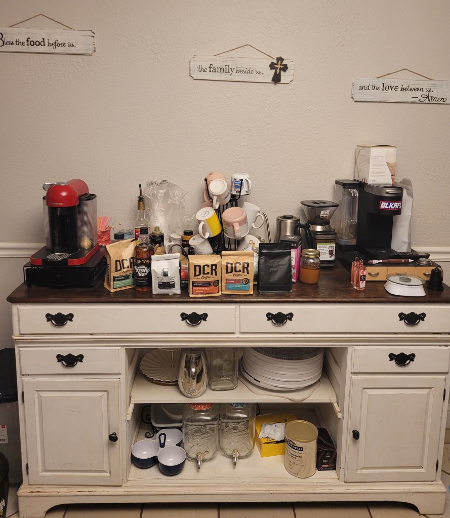 Long before we entered the coffee business, we were coffee lovers. My husband prefers the Keurig while I enjoy the rich boldness of the Nespresso machine, so we have one of each, along with our home espresso machine. My daughter and I are also tea lovers and have collected many varieties of bagged and loose leaf teas. A few years ago I found the perfect farm-style hutch for sale on a yard sale site and knew that it would be perfect for a home coffee bar. But as with most flat surfaces in our home, it became a drop zone. The cupboards filled up with old Torani bottles, half-used powders, and broken tea pots that we hoped to someday glue back together. The drawers were littered with empty boxes, teas we don’t even like, and expired hot chocolate packages. This place that we used to gather in the mornings to make our coffee has become an eyesore, a place that I avoid.