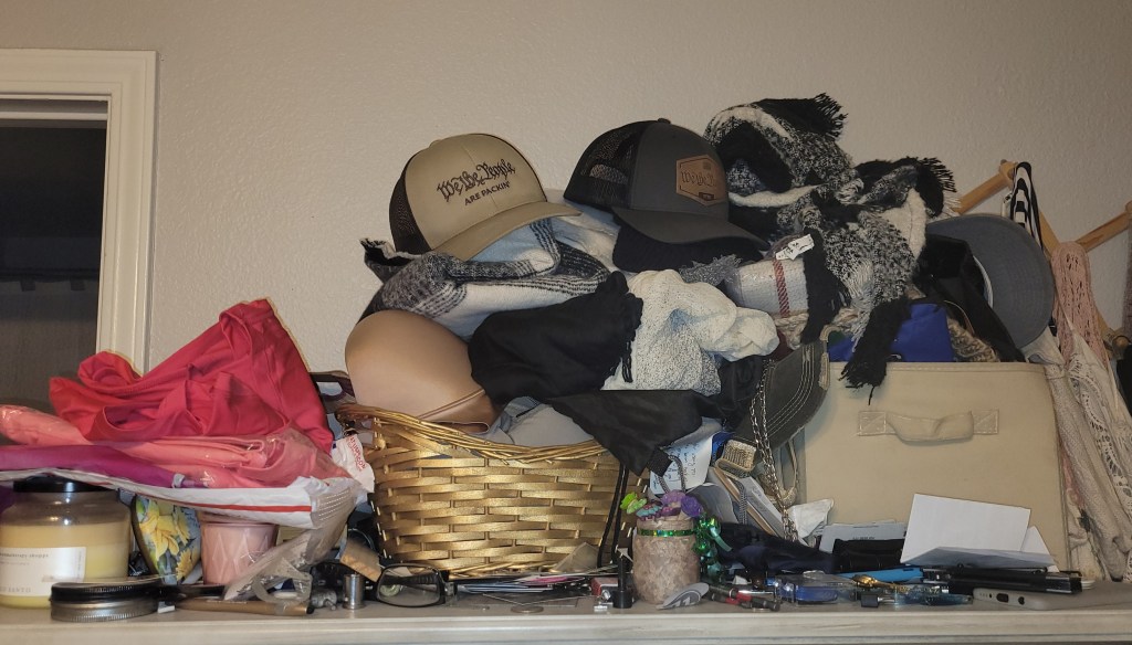 I have ignored the clutter on my dresser for about a year. I can tell you that ignoring a problem doesn’t make it go away. In fact, in the case of my dresser, it actually makes the problem worse – the piles grow! I decided over the weekend, while my husband was smoking beef on his new smoker, to tackle the dresser. Most of the big items were mine, but many of the smaller items were his, and I had no clue where to put them – like the duck call – where does one keep a duck call? I started by pulling off all of the big stuff and sorting it as I went – trash, donate, keep, but this time I added a pile I called keep, but not here. Once I got down to the smaller stuff, I did what I could, then called my husband in to help me clear his stuff. I dusted the dresser off, then went about placing the items I wanted to stay there back in an organized fashion. Some items went in the donation box, a few items went to the trash, and a purse or two got tossed into to the top of my closet. As I was tossing those purses on the pile of purses already in the top of my closet (I am not a purse person, I don’t even know why I have so many!), I thought to myself, “You’re going to have to deal with this mess soon!” I knew that I was just adding to a clutter pile I would have to deal with later, but that works for me. I can compartmentalize, deal with what I can in the now, and save the rest for another day. It has helped me get through. All told, I removed 11 scarves, 2 bras, 1 hat, 1 head wrap, 1 candle, 1 neck pillow, 2 jars, 1 tote bag, and 10 hair sticks for a total of 30 items. Now, when I walk into my bedroom, rather than avoiding looking at it, I am greeted by a clean space.