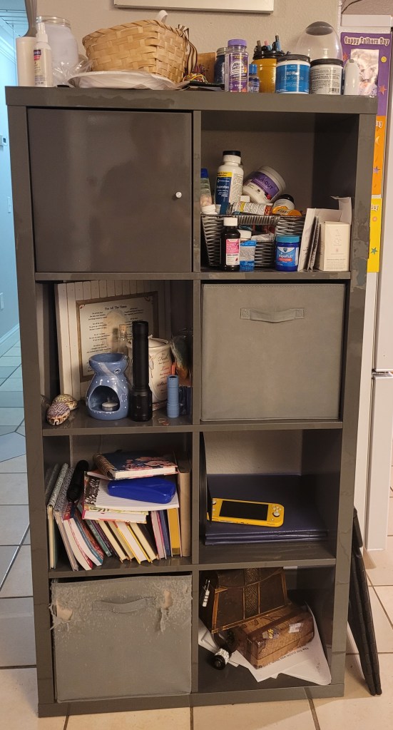 All told, I removed an additional 31 items from this shelf, including a Kung Fu Panda movie still in the shrink wrap, a basket used to collect chicken eggs, 1 rubber band ball, a candy dispenser, a really cool wedding invitation, 6 notebooks and a handful of miscellaneous items. I don’t have an after photo because I have not decided yet that I want to keep this shelf where it is. My daughter has expressed a desire to have it in her room, and it really has just become a drop zone. I still have some items on the top that I am looking for homes for. But I did fill my home with the scent of the ocean, and my office smelled of balsam wood and pine from a lovely candle I burned today.